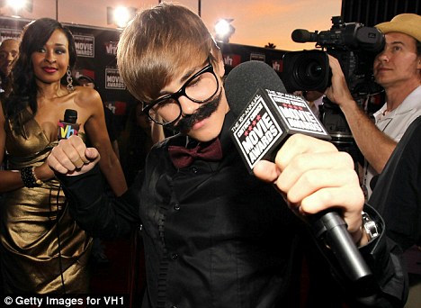 Master of disguise: Justin Bieber was fooling no-one in a large moustache and glasses at the Critics’ Choice Awards in Hollywood on Friday.